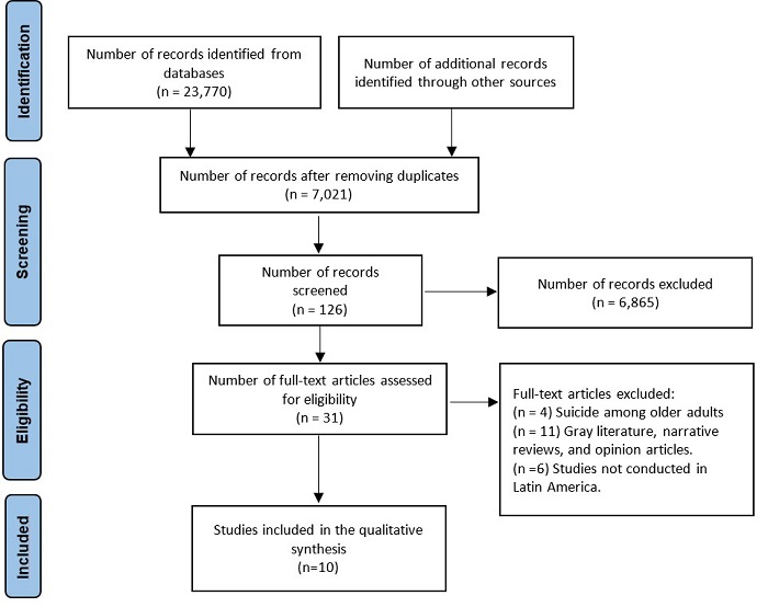 A total of 23,770 documents were identified in the initial search. After removing duplicates, 7,021 records remained, of which 6,895 were excluded for not meeting the research objectives. This left 126 records, from which 31 studies that met the research objectives were selected. Finally, 10 studies that met the inclusion criteria were included in the review (see Figure 1). All included studies followed an ecological design. Three studies were conducted in Brazil13-15, three in Mexico16-18, three in Colombia19-21, and one in Ecuador22. Additionally, 60% (6)14,17,19 of the studies were published within the last five years (Figure 1).