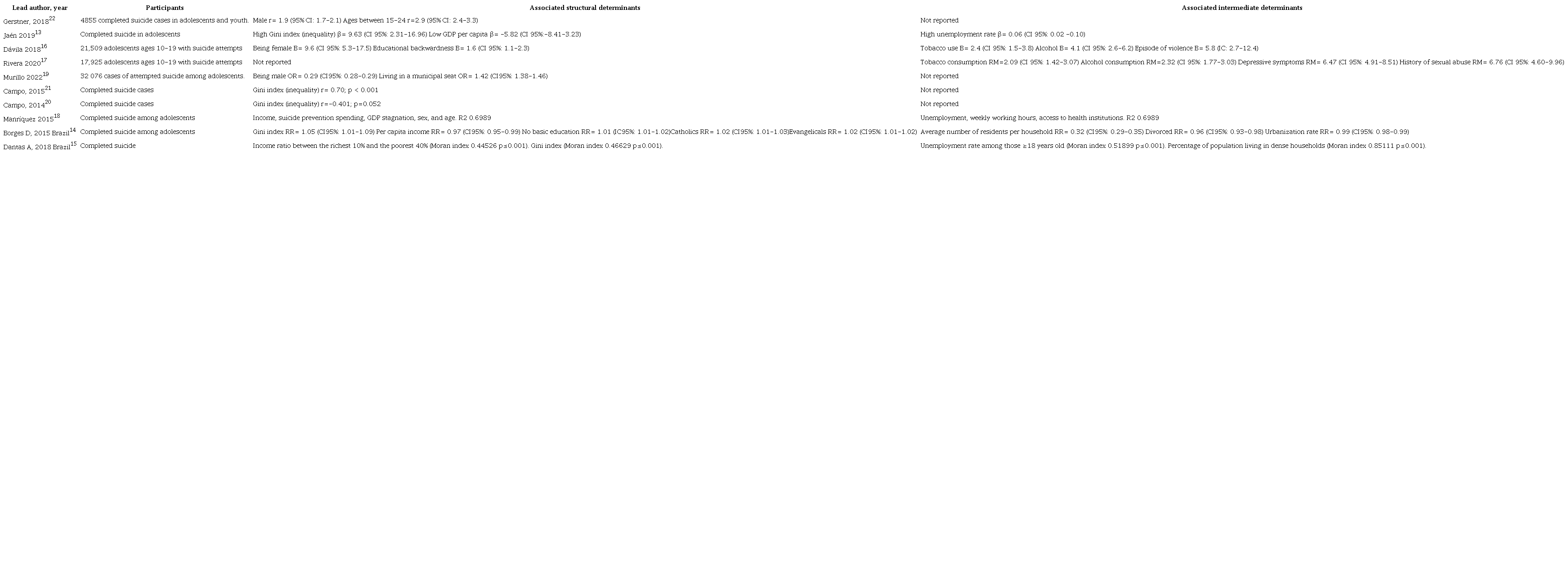 Resultados: Inicialmente, foram localizados 23.770 documentos, e finalmente incluídos 10. Os determinantes estruturais que foram associados ao suicídio foram ser do sexo masculino, ter idade entre 15-24 anos, índice de Gini, baixo Produto Interno Bruto per capita e ser católico ou evangélico. Já para a tentativa de suicídio os fatores mais prováveis foram atraso educacional, ser mulher e residir em capital municipal. Os determinantes intermediários para tentativa de suicídio foram uso de tabaco e álcool, episódios violentos e depressão.
