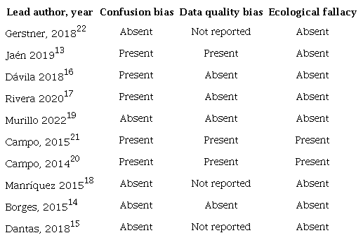 Risk of bias assessment. As there are no tools for assessing bias or conducting a critical appraisal of ecological studies to our knowledge, we analyzed the biases present in the articles included in this review based on criteria described in the literature9,10. These criteria identify three biases which ecological studies are susceptible to: confounding bias, data quality bias, and ecological fallacy. For this purpose, Morgenstern's recommendations11 were followed, as outlined below: