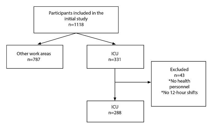 This study is a sub-analysis of a previously published research Project, “Fortalecimiento de Capacidades en Ciencia y Tecnología del Laboratorio de Biología Molecular de la Fundación Cardiovascular de Colombia para atender problemáticas asociadas con agentes biológicos de alto riesgo para la salud humana en Bucaramanga/Santander”10. For this study, all records of participants from the healthcare area working in the ICUs were included. At the same time, administrative or ancillary staff with shifts of less than 12 consecutive hours were excluded. No sample size calculation was performed; instead, all records of individuals meeting the inclusion criteria and not meeting the exclusion criteria were analyzed, resulting in a total of 288 participants (Figures 1). The initial study sample was selected based on convenience sampling.