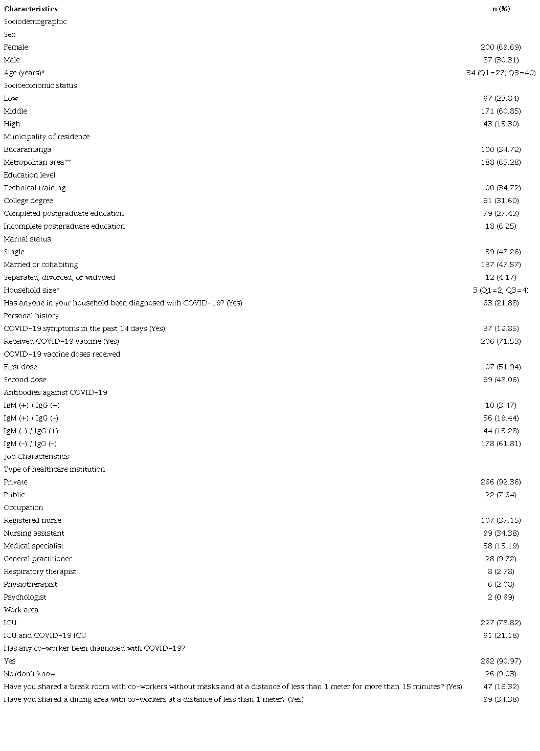 A total of 288 health personnel participants who worked in the ICUs of eight health institutions in Bucaramanga and its metropolitan area were included in the study. Women accounted for 69.69% of the sample, with a median age of 34 years (Q1=27; Q3=40). It was observed that the majority of participants belonged to a middle socioeconomic status (60.85%) and mainly resided in Floridablanca (43.40%) and Bucaramanga (34.72%). Regarding education, 34.73% had technical training, while 31.60% held university degrees.