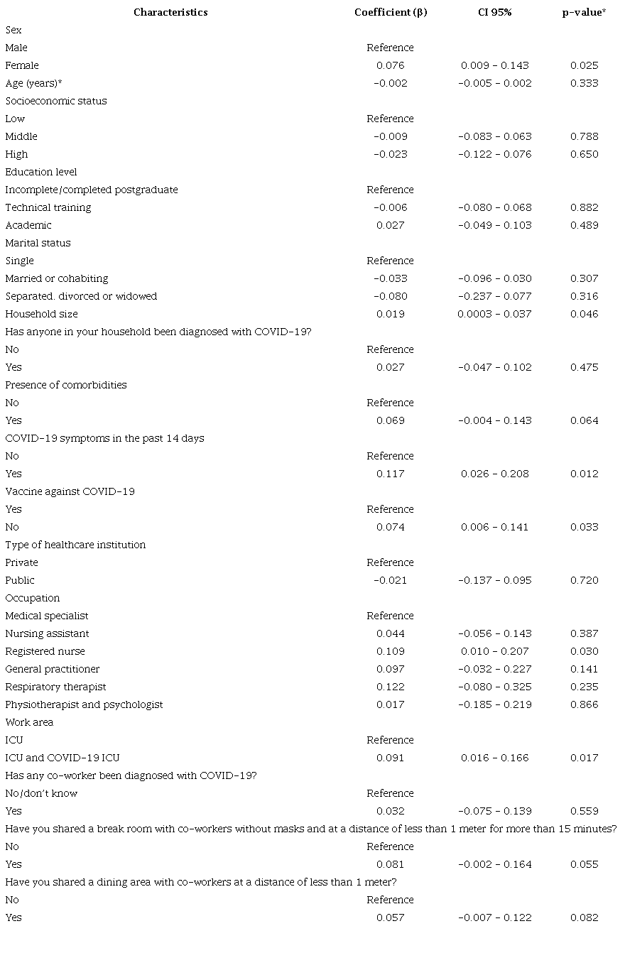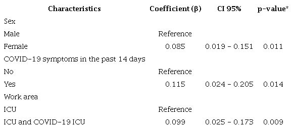 Finally, in the multivariate analysis, three variables were associated with anxiety and depression symptoms: female sex (female vs. male; β=0.085; 95% CI: 0.019 - 0.151), presence of COVID-19 symptoms in the past 14 days (Yes vs. No; β=0.115; 95% CI: 0.024 - 0.205), and work area (ICU vs. ICU and COVID-19 ICU; β=0.099; 95% CI: 0.025 - 0.173) (Table 3). These variables explained 5.27% of the variability in anxiety and depression symptoms (adjusted R-squared). The model did not meet the assumptions of normality or homoscedasticity, but no collinearity was evident (variance inflation factor < 10 for all variables).
