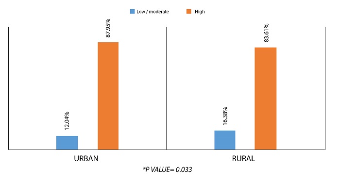 The most frequent CVR level for the study population was high, with a numerically higher proportion in the urban areas (87.95%) compared to the rural areas (83.61%). When comparing CVR level with geographic areas of residence, a statistically significant difference was found (p=0.033) (See Figures 1).
