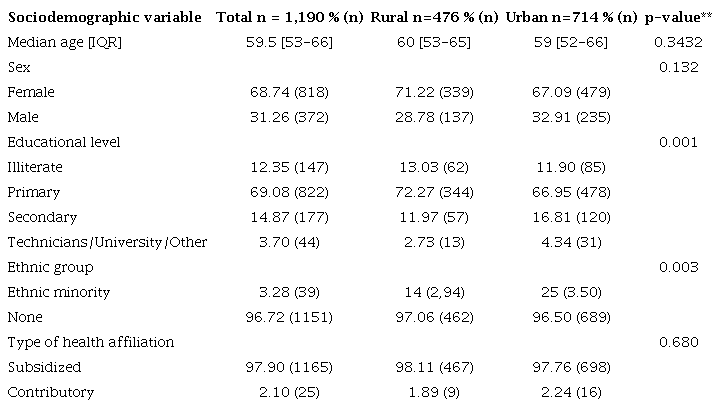 Results from 1,190 patients identified during the study period are presented. The median age of the study population was 59.5 years (IQR 53-66), with a median of 59 years in urban areas (IQR 52-66) and 60 years in rural areas (IQR 53-65). Regarding sex, a lower proportion of women was observed in urban areas (67.09%, n=479) compared to rural areas (71.22%, n=339). In terms of educational level, most of the population completed primary education, with a slight numerical difference between urban (66.95%, n=478) and rural areas (72.27%, n=344). Most patients had subsidized health affiliation in both urban (97.76%, n=698) and rural areas (98.11%, n=467). In addition, a comparison of variables and area (rural or urban) revealed statistically significant differences in educational level and ethnicity. Other demographic characteristics are shown in Table 1.