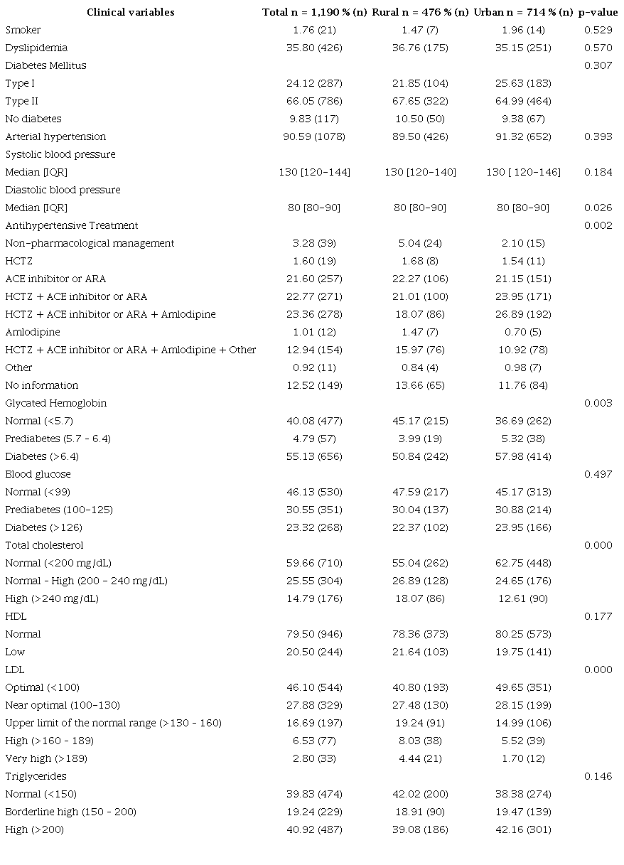 Regarding the study population's risk factors and clinical conditions, the proportion of tobacco dependence is low in urban (1.96%, n=14) and rural areas (1.47%, n=7). The proportion of dyslipidemia was similar in both areas (urban 35.15%, n=251 and rural 36.76%, n=175). Type II diabetes was proportionally more frequent in urban areas (64.99%, n=464) than in rural areas (67.65%, n=322). The AHT proportion was high in both urban (91.32%, n=652) and rural (89.50%, n=426) areas. In addition, a comparison of clinical variables by area (rural or urban) revealed statistically significant differences in diastolic blood pressure, antihypertensive treatment, glycosylated hemoglobin, total cholesterol, and LDL cholesterol. Other clinical characteristics are shown in Table 2.