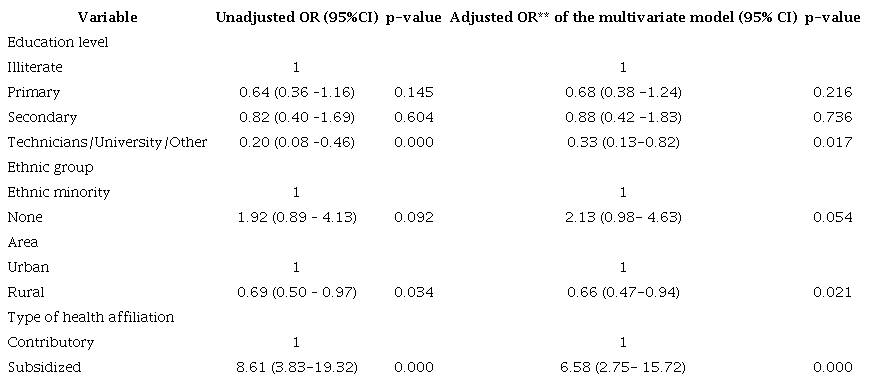 Finally, within the results observed in the multiple logistic regression, the final model included the following variables: primary education (OR: 0.68, CI 95%: 0.38–1.24), secondary education (OR: 0.88, CI 95%: 0.42–1.83), higher education (OR: 0.33, CI 95%: 0.13–0.82), rural area (OR: 0.66, CI 95%: 0.47–0.94), subsidized health affiliation (OR: 6.58, CI 95%: 2.75–15.72), and ethnicity (none) (OR: 2.13, CI 95%: 0.98–4.63). The latter did not reach statistical significance (see Table 3). Confounding and interaction variables were assessed, and none were identified.