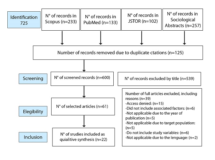 A total of 725 articles on patterns associated with domestic violence were reviewed using the ecological model approach. The studies were gathered from various valuable sources, including Scopus, JSTOR, Sociological Abstracts, and PubMed, covering the period from 2013 to 2023. Search terms like “gender violence,” “violence towards women,” “domestic violence,” “violencia de género,” and “violencia doméstica” were used in combination with Boolean operators (AND, OR) to refine results. From these searches, 22 articles that met the inclusion criteria were selected using a purposive non-probabilistic selection method11. The data from this study are stored and accessible in the repository of the University of Magdalena12.