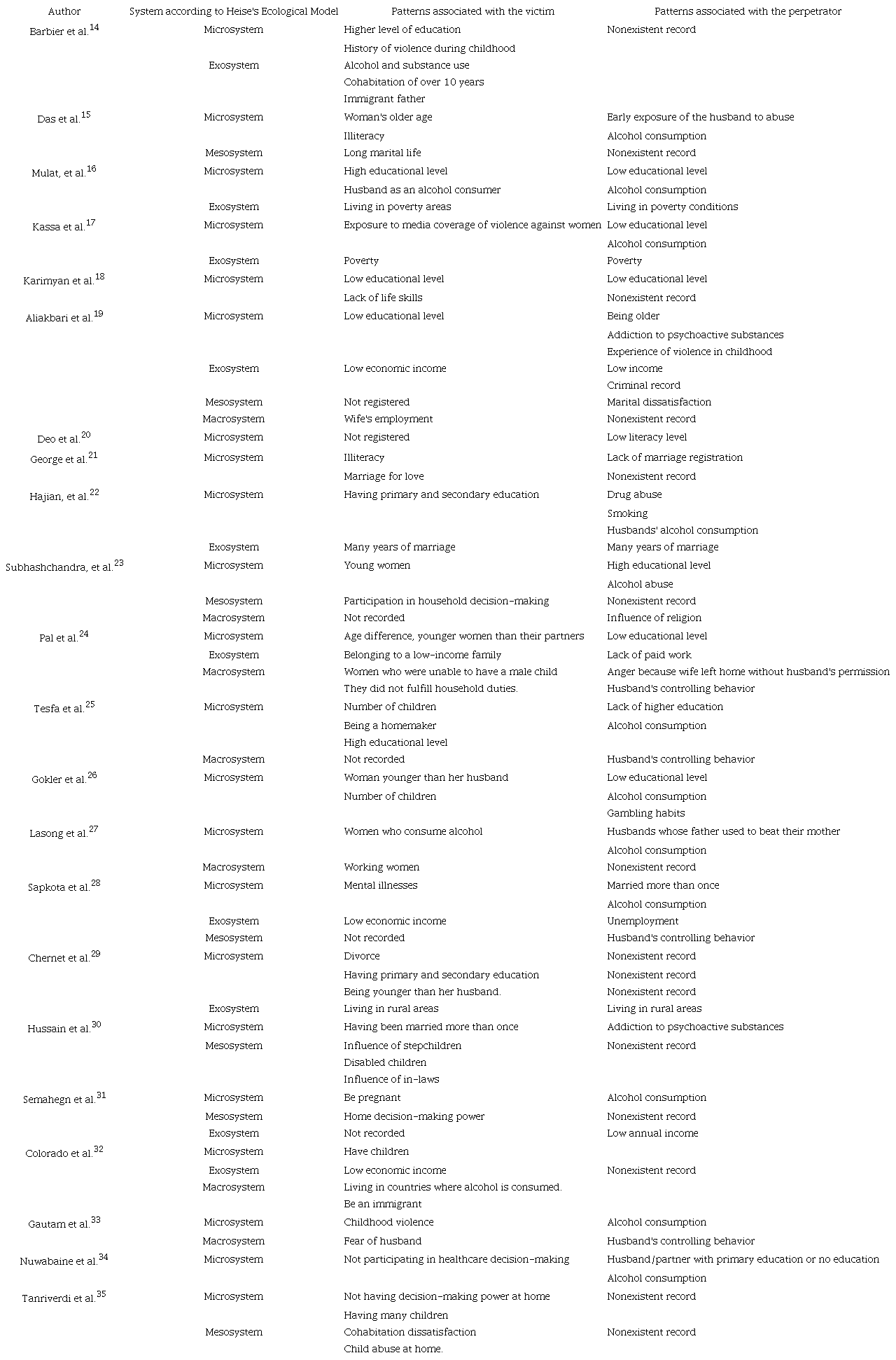 This section describes the factors linked to domestic violence from the ecological model conceptualized by Bronfenbrenner. The patterns found within the microsystem include the victim’s higher educational level14,16,17, the aggressor’s lower educational level18,19, illiteracy in both15,21,22, and the perpetrator's high level of education23.