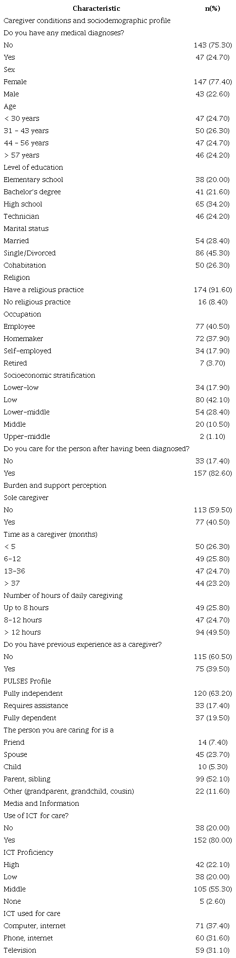 A total of 190 caregivers participated in the study, and their sociodemographic characteristics are shown in Table 1.