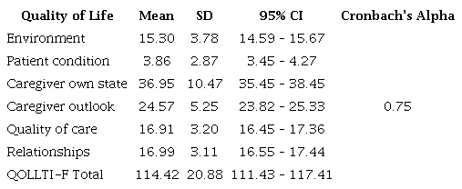 In terms of quality of life, the mean scores showed acceptable results for overall QOL. Below-average scores were found for the patient condition dimension and borderline scores for the caregiver’s state dimension. The internal consistency for the total scale domains was 0.75 (Table 2).