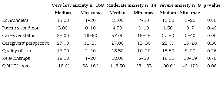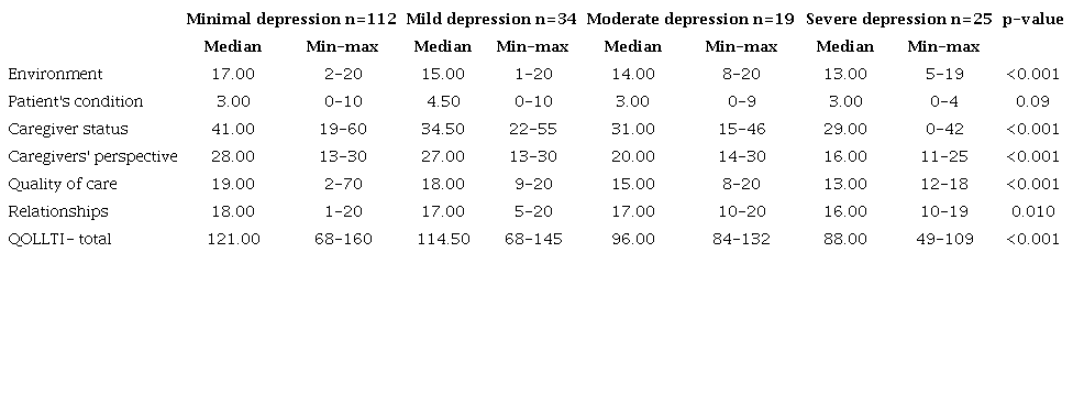The analysis against manifestations of anxiety and quality of life yielded statistically significant differences among caregivers in the dimension "caregiver status," with no other important results. On the contrary, statistically significant differences were found between the levels of depression and most of the caregivers' quality of life dimensions except for the patient's condition. Higher scores for the manifestation of moderate or severe depression were identified for the dimensions of environment, quality of care, and relationship (Tables 4 and 5).