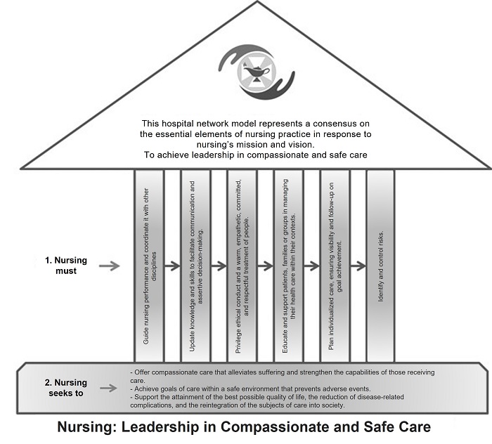 Phase 1. The common scenario to achieve the mission and vision of the new Hospital Network must reflect its humanistic nature. This requires a nursing staff whose attention is focused on service users, including patients and their families, and human resources in training. Nursing staff should show leadership, uphold ethical, respectful, and supportive behavior, be capable of teamwork, and reflect a vocation of service. Nursing practice must be based on the best available evidence and committed to quality in terms of safety, timeliness, continuous improvement, and the appropriate use of technology in each case. To achieve this purpose, a nursing model to guide nursing performance within the Hospital Network was deemed indispensable.