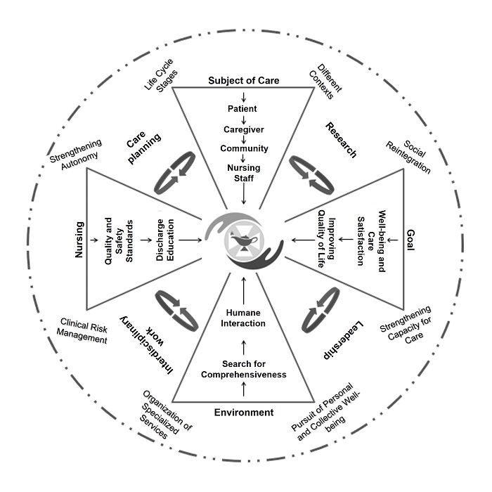 Within the nursing theoretical models, professional practice models have been emphasized as important to focus and ensure quality care across different levels of care. These models respond to the metaparadigm or universal agreement that nursing should focus on caring for individuals' health experiences wherever they are11. Professional practice models are associated with professional development and nursing leadership at the institutional level12. These models have proven valuable in implementing and improving nursing practice within networked health systems13. They have also been a valuable guide for nursing education and research14.