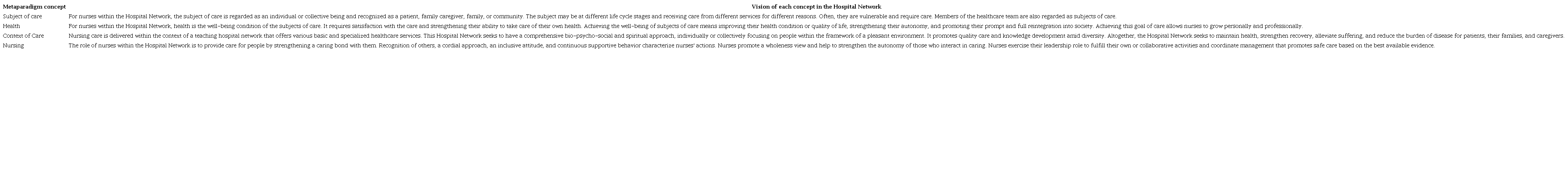Phase 2. The content analysis of the responses, which 87.00% of the Hospital Network's nursing staff provided, reflected four essential nursing concepts for the Hospital Network: subject of care, goal of nursing or health, context of care, and way of looking at nursing work (see Table 1).