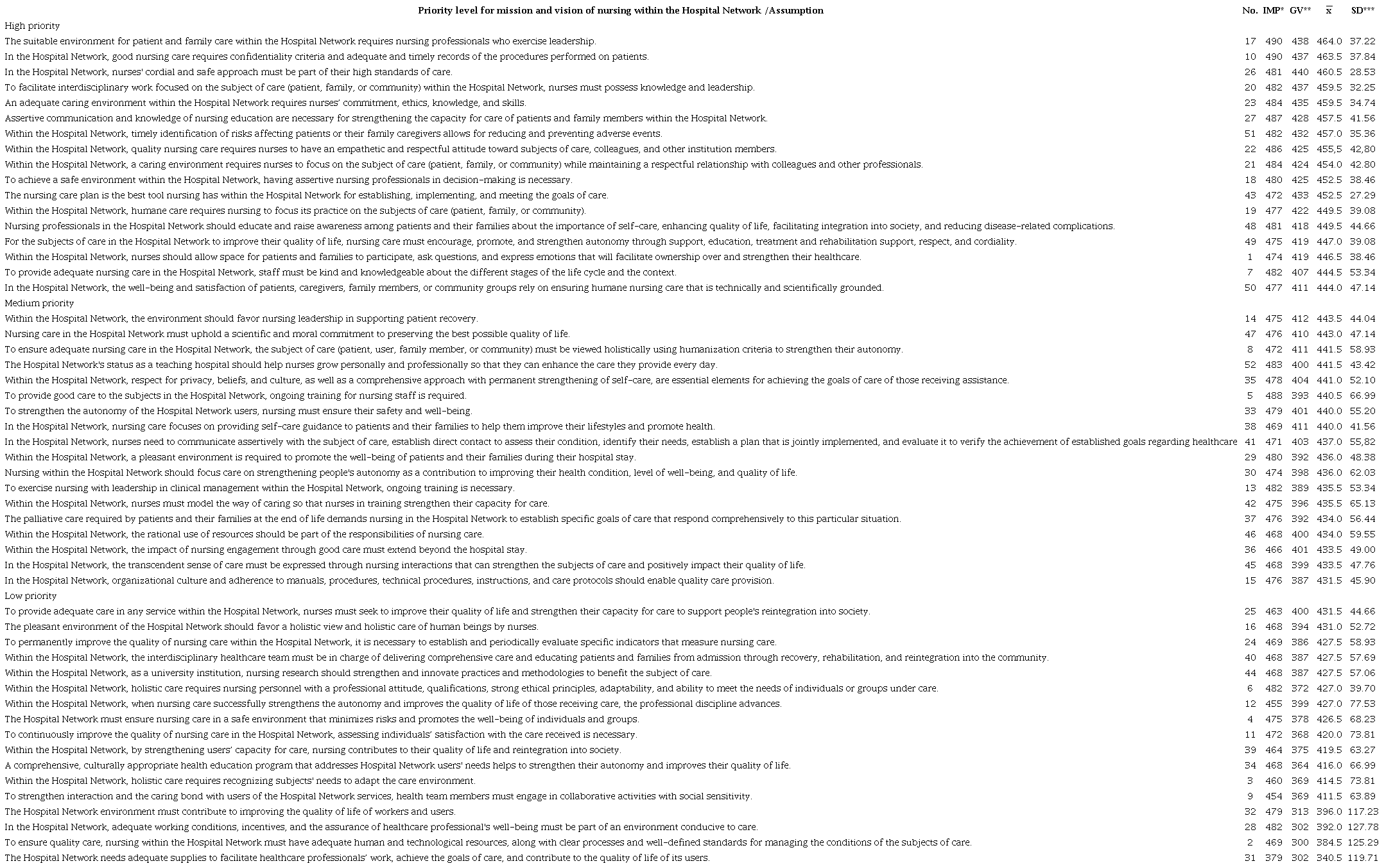Phase 3. From the groups' input, which included 51 nurses representing their respective services, the research group identified 52 assumptions of nursing care for the Hospital Network. These assumptions were then rated according to their importance and governance for nursing. Based on this input, the research group compared them with the results from Phase 1 and determined that, to fulfill the mission and vision of nursing within the Hospital Network, 16 assumptions were of high priority, 19 were of medium priority, and 17 were of low priority (see Table 2).