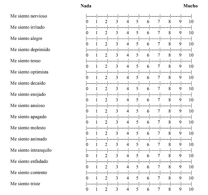 A continuación, encontrarás una serie de frases que describen diferentes clases de sentimientos y estados de ánimo, y al lado unas escalas de 10 puntos. Lee cada frase y rodea con un círculo el valor de 0 a 10 que indique mejor cómo te SIENTES AHORA MISMO, en este momento. No emplees demasiado tiempo en cada frase y para cada una de ellas elige una respuesta.
