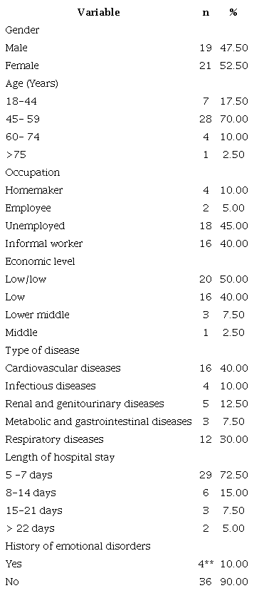This study, conducted with 40 participants, provided relevant demographics and socioeconomic characteristics. Most participants were women, and the predominant age group was individuals between 45 and 59 years old. In terms of employment, a significant proportion were unemployed, while a considerable number worked in informal jobs, reflecting a notable economic vulnerability. Most participants came from low or very low socioeconomic backgrounds, which aligns with the typical profile of patients treated at the public hospital where the research was conducted. Cardiovascular diseases were the most prevalent condition among the participants. Furthermore, most patients had been hospitalised for 5 to 7 days, and only 4 participants reported having experienced some form of emotional disorder in their lifetime, although none were in an acute or chronic phase at the time of the study ( Table 1).