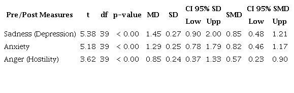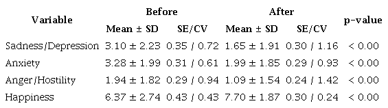 The sadness/depression variable showed a significant difference between pre- and post-intervention measurements following laughter therapy with healthcare clowns in the studied group (t= 5.38, p < 0.00) and a large effect size (Cohen's D = 0.85, 95% CI=0.48- 1.21). Likewise, for anxiety, the test showed a statistically significant difference between pre- and post-intervention measures (t= 5.18, p < 0.00) with a large effect size (Cohen's D = 0.82, 95% CI=0.46- 1.17). These results indicate a clinically relevant impact of laughter therapy in controlling sadness/depression and anxiety in the studied individuals (Table 3).