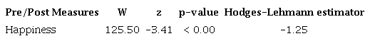 The results also indicated that laughter therapy with healthcare clowns had a statistically significant impact on happiness levels (W=125.00, p= <0.00), leading to an overall increase. Additionally, the negative Hodges-Lehmann estimator suggests that the median difference is less than zero, indicating that the pre-intervention happiness score tended to be lower than the post-intervention happiness score. The estimated magnitude of this change is around 1.25 units higher in the post-intervention medians using this laughter therapy (Table 4).