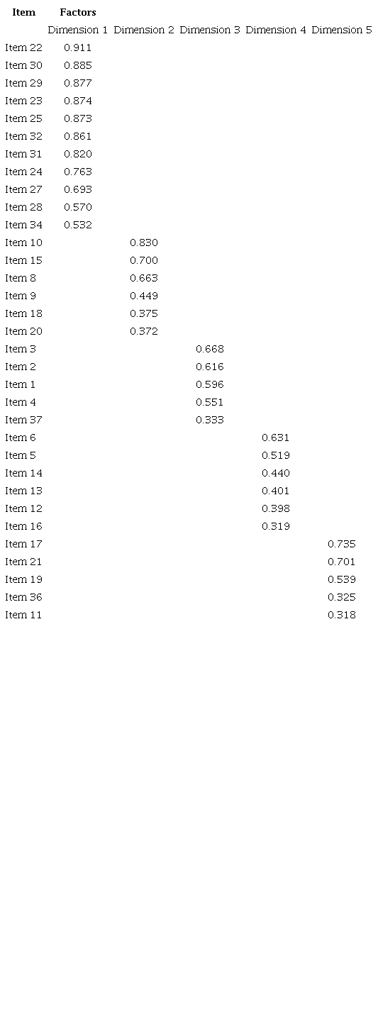The verification of item assumptions was significant (p < 0.001) using Bartlett's test of sphericity and the KMO test for measures of sampling adequacy (MSA > 0.70). Item 7 (MSA= 0.630) and items 26, 33, 35, and 38 were discarded because they did not fit into any dimension (Table 1).