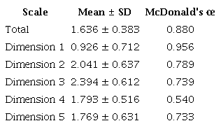 Data were processed using the SPSS statistical package and stored in Mendeley Data19. Aiken's V was used to determine inter-rater agreement and was considered optimal when the value was > 0.75. The Kaiser-Meyer-Olkin (KMO) and Bartlett's sphericity tests were used to verify the assumptions, both of which were sufficient to apply exploratory factor analysis (EFA) and assess construct validity. EFA was performed using promax rotation and principal axis extraction methods. Reliability was determined using McDonald's œ, a test to calculate reliability when variables are ordinal and have three to four categories. All statistical tests were performed with a p-value < 0.05.