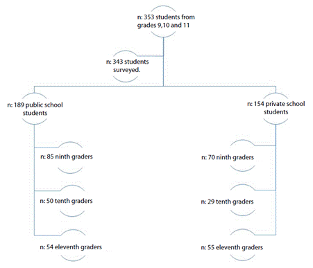 Data were collected from 343 students who volunteered to participate in the study. 55.10% (n=189) were students from the public school, and 44.90% (n=154) from the private school. The 45.20% of students were 9th graders (Figure 1).