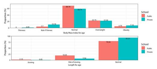 The prevalence of nutritional alteration was 35.78%, slightly higher among adolescents in the private school (40.26%) compared to the public school (31.22%). Among the students in both institutions, 28.28% were overweight, making it the most common alteration (Figure 2).