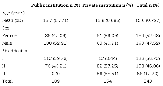 The mean age of the students surveyed was 15.6 (SD=0.727) years, and 52.48% were female. It was observed that 82.80% of the students were from socioeconomic strata 1 and 2, and there were no students from socioeconomic strata 3 in the public school (Table 1).