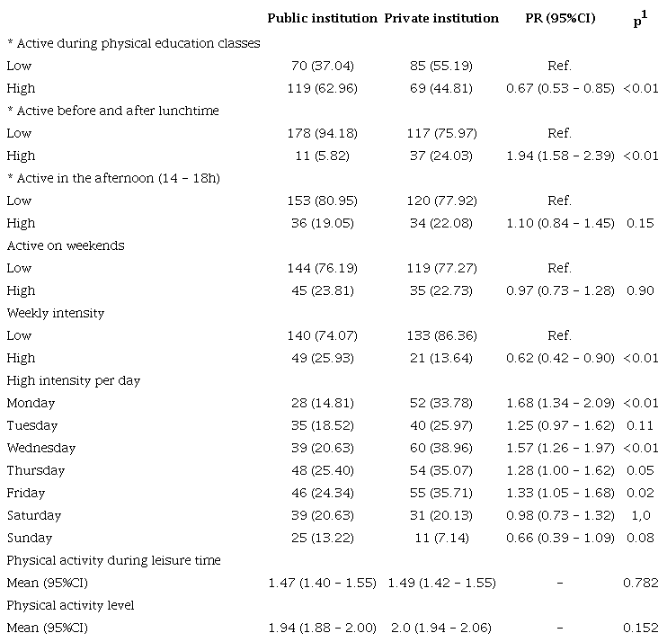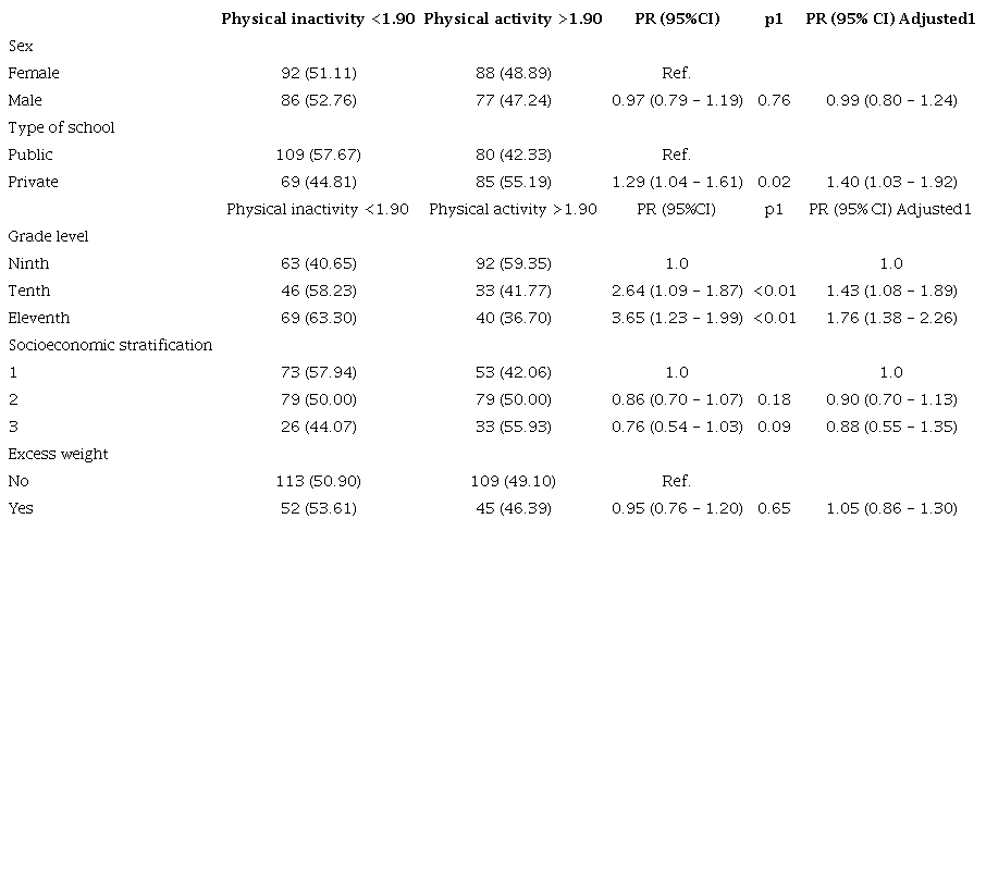 Results: Information was collected from 343 students, of whom 55.10% (n=189) were from a public school. The 28.28% were overweight. The overall level of physical activity in adolescents was low (mean= 1.97 95% CI 1.92 - 2.01). It was found that public school students were more inactive adjusted (PR= 1.40; 95% CI 1.03 - 1.92) compared to private school students.