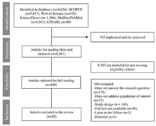 The database search stage yielded a total of 9,624 identified studies. After the selection process, 58 studies composed the final sample, as outlined in the flowchart shown in Figure 1.