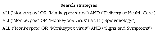For the search strategy, the descriptors indexed in the Medical Subject Headings (MeSH) were used: "Monkeypox," "Monkeypox virus" "Delivery of Health Care," "Epidemiology," and "Signs and Symptoms". Three search strategies were developed for the SCOPUS database, and were adapted to the other databases, considering their particularities (Table 1).