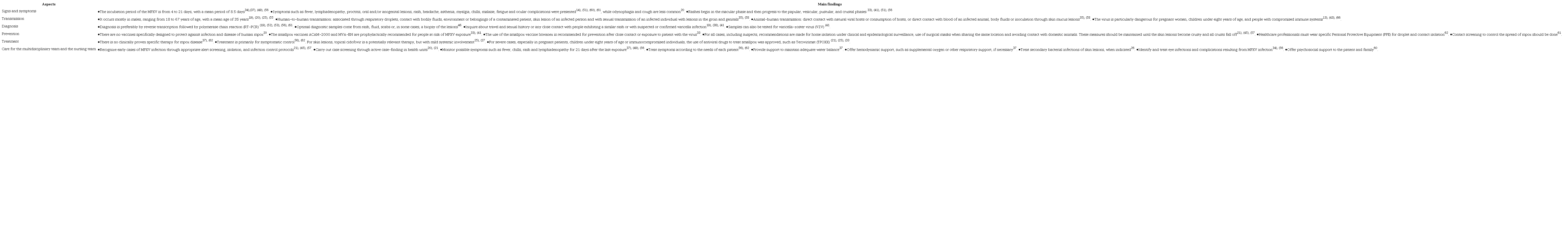 Information available in the literature about the main clinical aspects related to human mpox cases was identified, namely: signs and symptoms, transmission, diagnosis, prevention, treatment and care for multidisciplinary team and the nursing team. Based on this, an analysis was conducted, and relevant information was compiled and organized in the results of this review.
