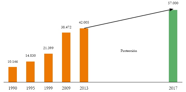 El modelo planificado de desconcentración policial también fue costeado por la Secretaría de Planificación, previendo una inversión de más 1.400 millones de dólares a 2017 y la incorporación adicional de 17.000 miembros policiales. Todo esto para cumplir normas internacionales sugeridas en relación con el número de policías necesario, que para 2017 llegaría a 57.000 miembros en Ecuador; es decir, más de 3.5 policía por cada 1.000 habitantes (gráfico 3).