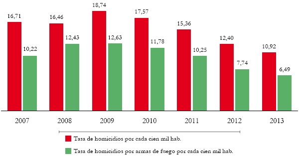 Estas acciones emprendidas por el gobierno a partir de mayo de 2011 han venido aparejadas con mejoras en los índices de ciertos delitos. Por ejemplo, se ha promocionado con insistencia las reducciones importantes en materia de homicidios, la misma que presentó una reducción de casi 7 puntos entre 2010 a 2013 pasando de 17,57 por cada 100.000 habitantes a cerca 10,92, respectivamente (Ministerio del Interior, 2014a). A esta reducción, expuesta como la carta de presentación de los logros en materia de seguridad del gobierno durante los últimos años, también se suman las disminuciones en los homicidios por armas de fuego y la disminución del secuestro express, que pasó de 896 casos en 2010, a 494 en 2013, entre otros delitos (gráfico 4).