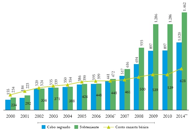 Una de las señales más significativas del Gobierno respecto a la dignificación del trabajo policial fue sin duda el incremento salarial. Desde 2007 existió un progresivo aumento en el ingreso policial. En los momentos actuales, un policía recién ingresado a la institución recibe de ingreso 933 dólares, cantidad casi tres veces mayor que lo recibido en 2007. Como se puede ver en el gráfico 6, este ingreso duplica el costo de la canasta básica familiar para un cabo segundo de policía. Esto ha sido, incluso criticado para varios sectores sociales, dado que el ingreso básico de la Policía supera en creces el ingreso de un médico recién egresado y el de un maestro, habiendo cursado menos años de estudio.