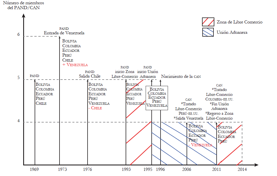 El desarrollo institucional de la región registra los retrocesos de la zona en relación con los objetivos iniciales. La salida de Venezuela (2006) consagró el debilitamiento político de la CAN. En consecuencia, la evolución del regionalismo en la CAN se descompuso (gráfico 1).