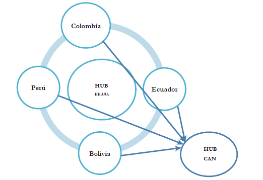 En el caso de la CAN, los TLC firmados por los EE.UU. y la Unión Europea con Colombia y Perú son recientes, por esta razón sería prematuro hacer una evaluación de los efectos del tratado bilateral en estas economías. Sin embargo, dado que EE.UU. representa el mercado de destino hub más importante de las exportaciones extracomunitarias de los países de la CAN, es posible adelantar la hipótesis de que las relaciones comerciales con el hub han generado efectos de arrastre importantes en las estructuras productivas de los países de la CAN (spokes).