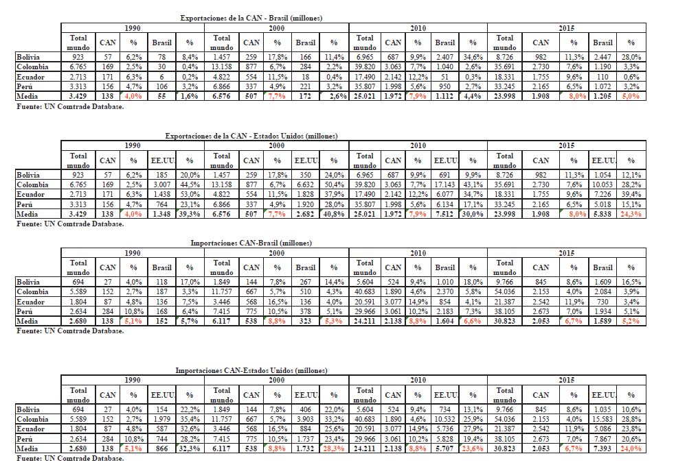 De hecho, la importancia de los flujos de comercio de la Comunidad Andina de Naciones (CAN) con EE.UU. corrobora el hecho de que el conjunto de las economías andinas evoluciona al ritmo de la relevancia de las relaciones comerciales que mantienen con su poderoso vecino. EE.UU. desempeña el papel de “locomotora” de cara a las exportaciones de América Latina. En la actualidad, los países de la CAN continúan siendo altamente dependientes del mercado norteamericano en el suministro de materias primas.