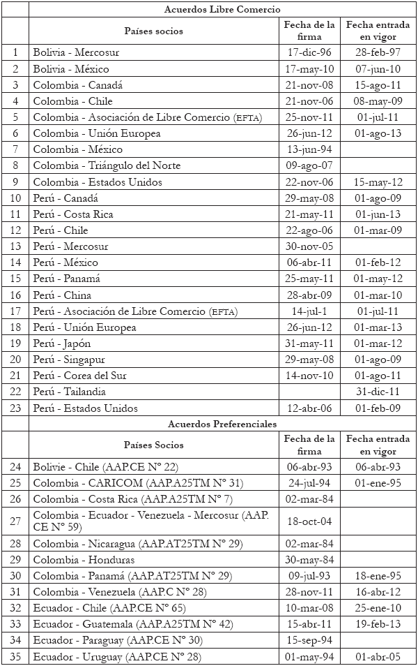 Entre los años 2000 y 2013, se pudo constatar una proliferación de negociaciones bilaterales de los países miembros de la CAN con varios países y regiones (anexo 1). En este contexto, y dado el fracaso de las negociaciones de la CAN como bloque regional con EE.UU. y la Unión Europea, los dos países andinos con los mercados domésticos más importantes de la región, Colombia y Perú, firmaron finalmente acuerdos de libre comercio con estos dos mercados en detrimento del régimen comercial andino. Ecuador, por su parte, ha firmado un acuerdo de libre comercio con Europa, que entró en vigor el 1 de enero de 2017.