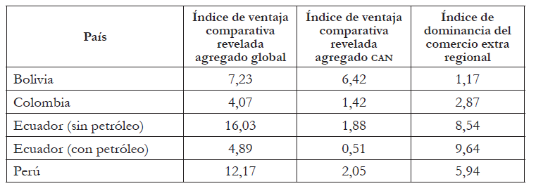Bolivia es la economía más pequeña de la región; dado el tamaño relativo de su economía, su comercio con la CAN es el menos significativo. Sin embargo, registra los índices más altos de VCR en el comercio con la CAN. Esto demuestra que para Bolivia el mercado de la CAN tiene más importancia relativa que para los otros países miembros debido a la participación proporcional más baja de este país, lo que implica que el espacio que representa el mercado andino, en comparación con la capacidad de exportación de Bolivia, es mayor para este país que para los otros países miembros.