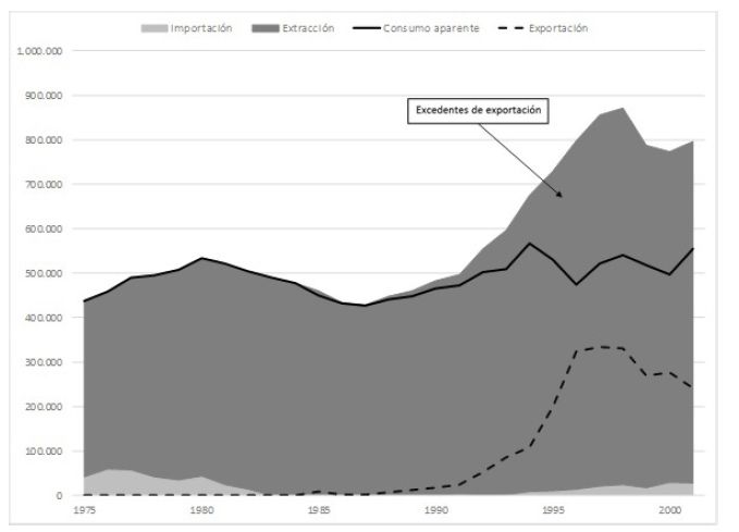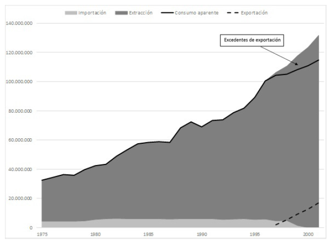 Si la tasa anual acumulativa de extracción en el periodo precedente era de apenas 1 % y prácticamente invariable en el caso del consumo, la tasa de extracción en el periodo de estudio subió hasta 4,4 % y la de consumo hasta 1,8 %. Una diferencia de 2,6 puntos porcentuales. Esa diferencia entre las tasas de extracción y consumo se estira hasta casi 5 puntos porcentuales cuando se realiza un recorte del intervalo 1989-1998: 7 % frente a 2,1 %, respectivamente15.
