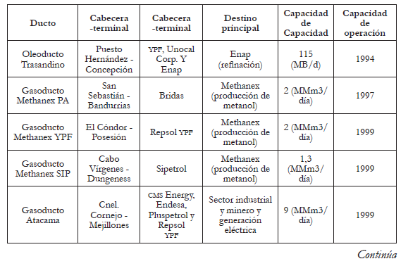 El primer ducto transfronterizo fue el emplazado en 1994 con dirección a Chile para exportar crudo neuquino. Se trata del Oleoducto Trasandino, el cual tiene una capacidad máxima de transporte de 115 mil barriles por día (b/d) y une Puesto Hernández, en la Cuenca Neuquina, con Concepción (Chile), cruzando la Cordillera de Los Andes. Su construcción corrió por cuenta de un consorcio privado conformado por YPF S.A. con una participación del 57,5 %, Banco Río con el 30 % y la chilena ENAP con el 12,5 %. En aquel entonces, Chile importaba el 75 % de sus necesidades de petróleo desde Nigeria y Medio Oriente. Por medio del oleoducto, reemplazaría la mitad de esas importaciones por un crudo a más bajo costo al evitar el flete por barco desde aquellos países. El crudo tenía como destino principal la refinería Petrox, propiedad de ENAP, mientras que los excedentes de producción no vendidos en el mercado chileno podrían cargarse en buques tanques para ser comercializados a través del Pacífico (El Cronista, 1994). Para el Presidente de YPF S.A., José Estenssoro: