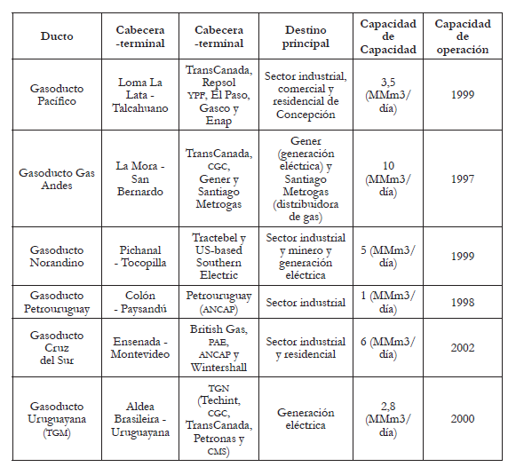 El mercado regional de gas se materializó a través del emplazamiento de una decena de gasoductos de exportación entre 1997 y 2002. Cuentan con una capacidad total de transporte de 42 millones de metros cúbicos por día (MMm3/d), equivalente a un tercio de la producción local de 2001: siete dirigidos a Chile, dos a Uruguay y uno a Brasil (ver cuadro 1). Tanto la construcción de los gasoductos como los contratos entre vendedores y compradores se realizó por parte de operadores mayormente privados. Los Estados se limitaron a garantizar las condiciones generales para el intercambio comercial. No se crearon organismos de seguimiento de los compromisos asumidos y tampoco mecanismos de anticipación de situaciones de riesgo de suministro (Bertero, 2007).