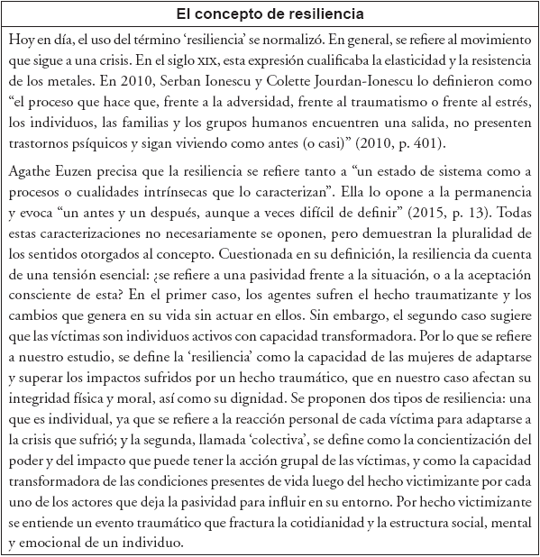 Por consiguiente, las mujeres víctimas de violencias sexuales tienden a encerrar su sufrimiento sin tener ninguna posibilidad de socializar su vivencia y su dolor. Sin embargo, es importante y necesaria esta socialización para poder empezar el proceso de liberación y apaciguamiento. El hecho victimizante genera emociones tales como el miedo, el odio, la culpabilidad o la vergüenza, que las mujeres ocultan e interiorizan. El caso de las víctimas de violencia sexual es emblemático a la hora de ejemplificar las consecuencias específicas del conflicto armado en las mujeres, pero, incluso si no han sufrido este tipo de daño, tienden a elegir el silencio y el encerramiento como estrategias de resiliencia privilegiadas para preservar la normalidad de la cotidianidad.