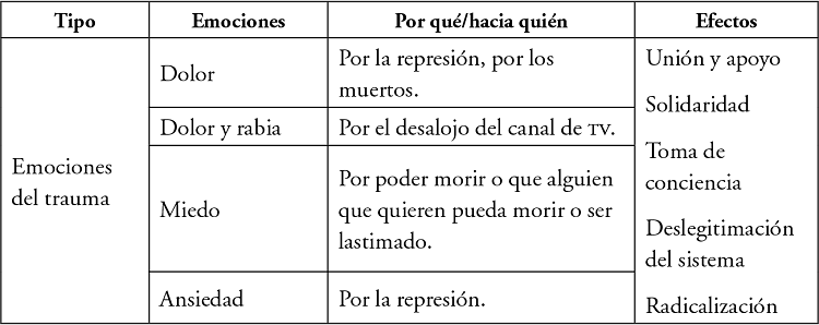 La represión produjo dolor, “[fue] una experiencia tan difícil porque vimos morir gente” (FG1_E10), y también miedo y ansiedad o agobio, como muestra este otro testimonio: “Hubo un momento en que estábamos en el canal [de televisión ocupado] y de verdad era estar bajo presión por mucho tiempo. Esos momentos no nos los quita nadie. Esos son los momentos en que estuvimos viviendo y a lo mejor en peligro de morir en cualquier momento, pero juntos” (FG1_E11).