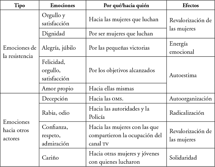 En el apartado anterior describimos el cambio vivido por las mujeres de Mujer Nueva, ahora queremos presentar un análisis de las emociones que influyeron en este cambio. Para organizar las emociones, hemos aplicado unas categorías propuestas en la literatura que estudian el papel de las emociones en la protesta, y en particular las emociones del trauma y de la resistencia (Whittier, 2001; Gravante, 2018; Poma & Gravante, 2019), y las emociones que emergen de la relación con otros actores, que hemos resumido en la tabla 1.