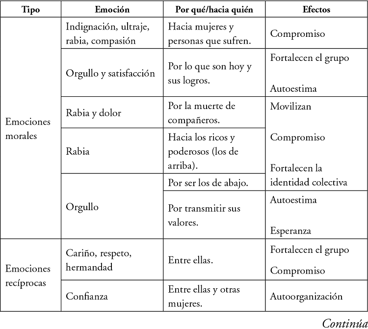 Apoyándonos en la categorización de emociones propuesta por Jasper (1998, 2011, 2018), hemos querido destacar el papel de algunas emociones morales y recíprocas (Jasper, 1997, 2018), que, como veremos, se fortalecen y legitiman en el nuevo proyecto Mujer Nueva, y alimentan la identidad colectiva y los valores de las mujeres. Junto con estas, también mostraremos de qué forma emergen algunos estados de ánimo y algunas ‘emociones positivas’ como resultado del empoderamiento.