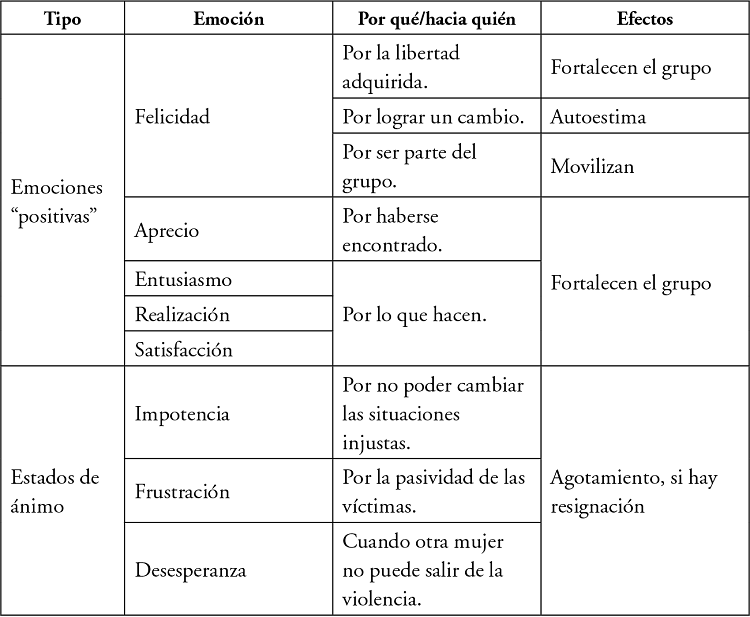 Estos resultados han sido posibles gracias al seguimiento del colectivo durante varios años, y a la aplicación de los avances de literaturas diferentes (una sociológica y otra psicológica) que nos proporcionaron pistas para poder comprender el proceso de empoderamiento de las integrantes de Mujer Nueva. La sistematización resumida en las tablas 1 y 2 muestra no solo la utilidad de organizar las diferentes emociones que emergen en el trabajo de campo en categorías que otros autores han desarrollado, sino la necesidad de definir con la mayor precisión posible en qué circunstancia los sujetos sienten estas emociones y los efectos de estas, para superar los límites que genera la objetivación de las emociones, es decir, la reducción de las emociones en una categoría única que las hace difícil de analizar.