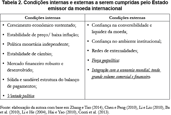 Considera-se que para o cumprimento das funções acima elencadas, uma moeda nacional deve antes estar associada a um Estado que ofereça condições internas e conte com condições externas que a gabarite poder cumprir um papel internacional, conforme elenca-se no tabela 2.