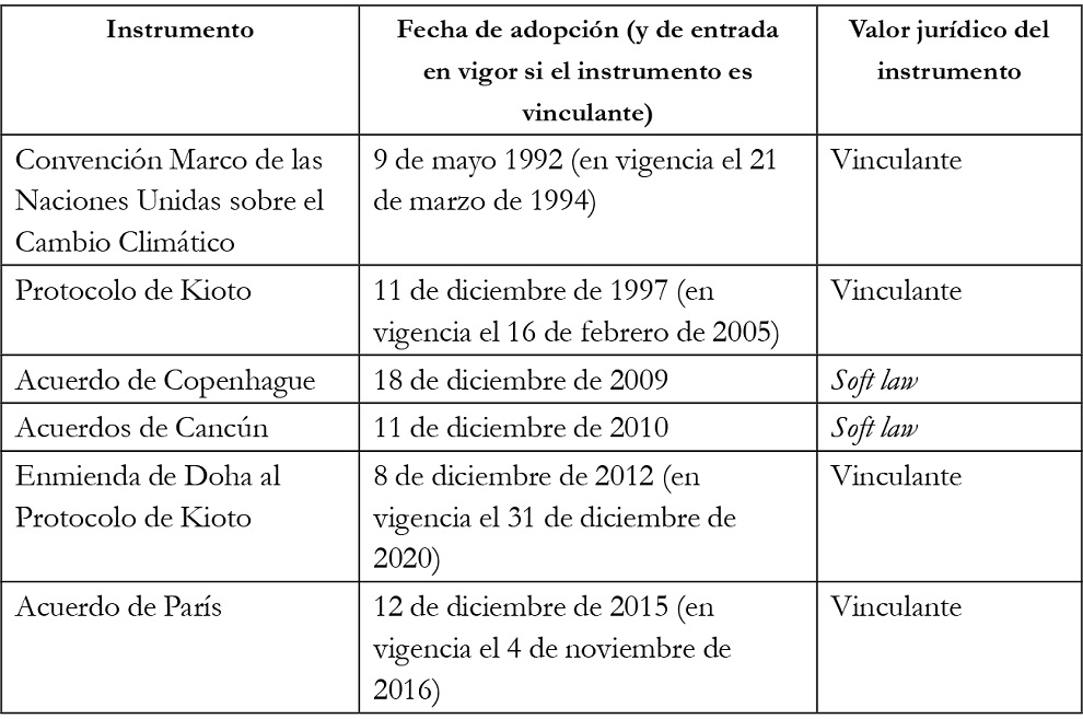 Esta escala normativa se ha visto reflejada en el área climática en que, en el marco de las negociaciones para implementar la CMNUCC, se han adoptado acuerdos jurídicamente vinculantes, como el Protocolo de Kioto de 1997 y el Acuerdo de París de 2015, e instrumentos de soft law cuando no ha sido factible lograr un acuerdo vinculante, como el Acuerdo de Copenhague de 2009 y los Acuerdos de Cancún de 2010 (tabla 1).